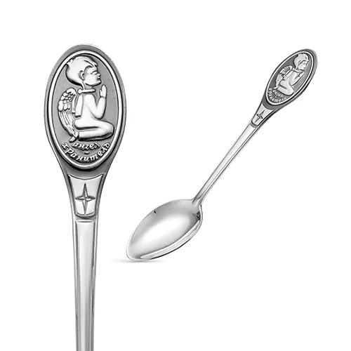 Ложка детская с ангелом-хранителем "Мальчик" Серебряная чайная ложка с ангелом «Мальчик» бесспорно станет хорошим, памятным подарком для мальчика. В верхней части черенка расположено символичное изображение мальчика с крыльями, напоминающего ангела и надпись «Ангел-хранитель». Ложечка очень удобна в использовании.