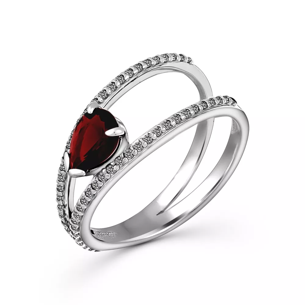 106987-006-0019 Кольцо (Ag 925) Фианит бесцветный круг 1, Гранат груша 5*7