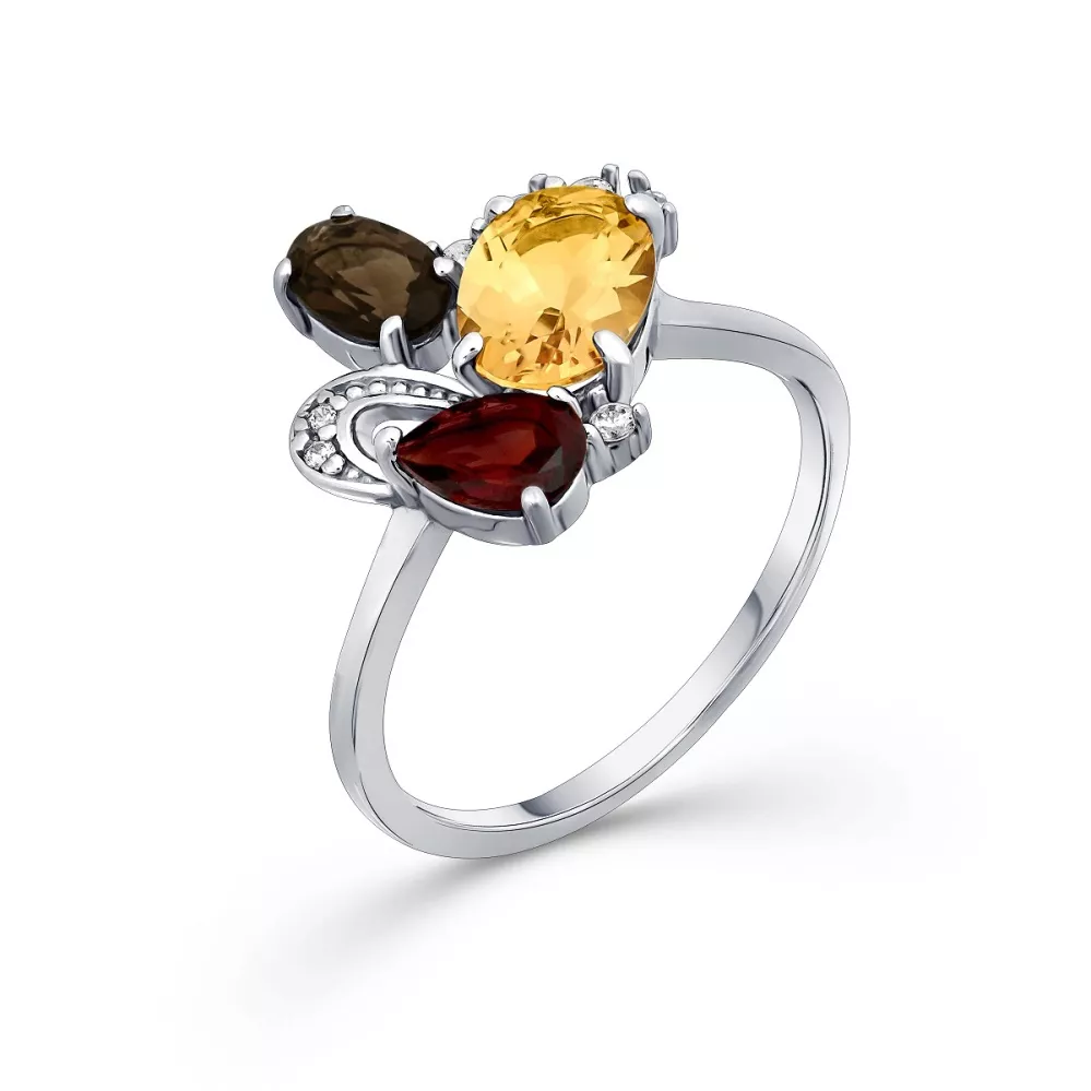 106761-901-0019 Кольцо (Ag 925) Цитрин овал 6*8, Фианит бесцветный круг 1, Фианит бесцветный круг 1,5, Раухтопаз овал 4*6, Гранат гр