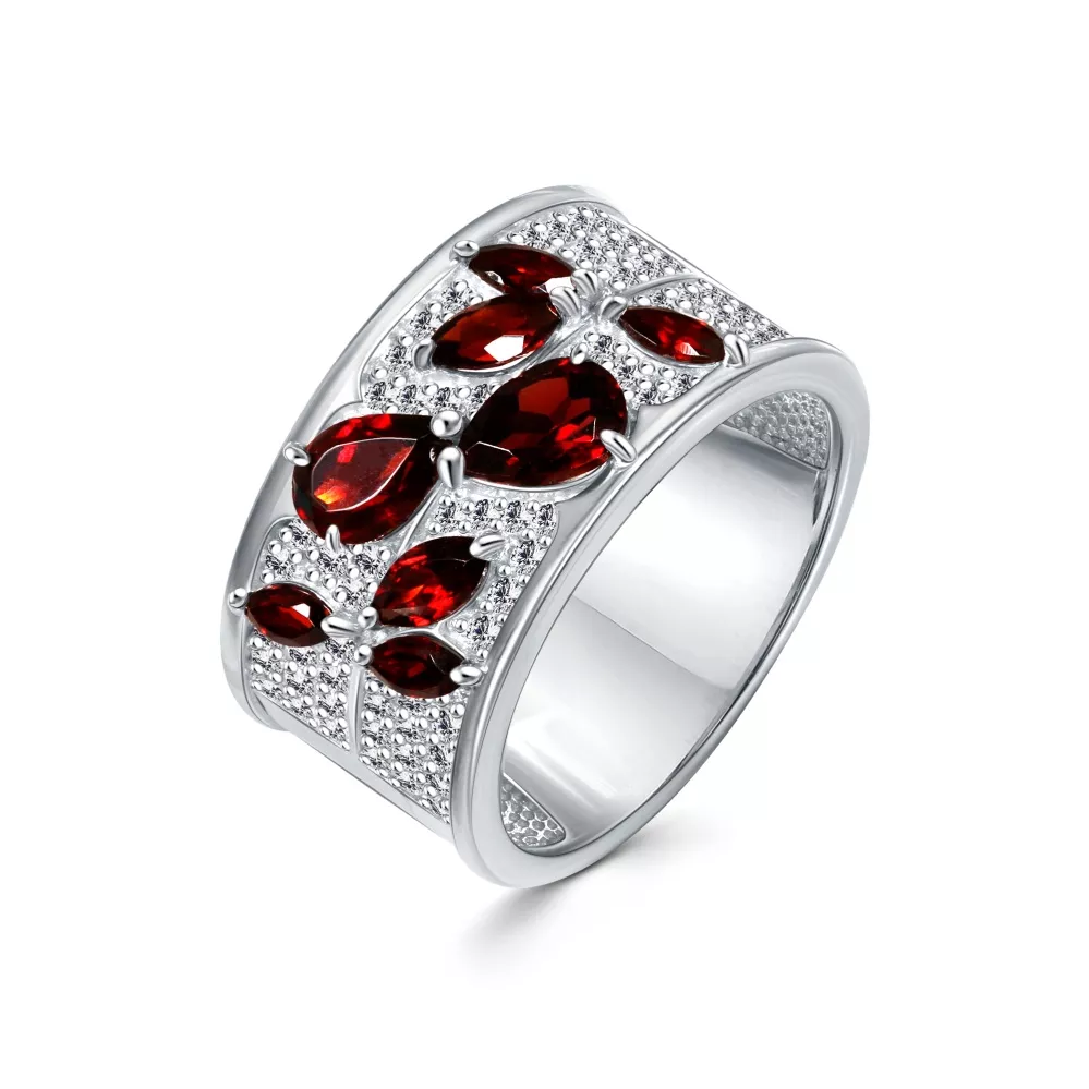 108399-006-0019 Кольцо (Ag 925) Фианит бесцветный круг 1, Фианит бесцветный круг 1,25, Гранат груша 4*6, Гранат маркиз 2,5*5, Гранат