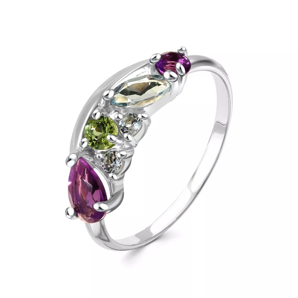 106990-901-0019 Кольцо (Ag 925) Хризолит круг 3, Топаз голубой маркиз 3*6, Топаз голубой круг 2, Аметист фиолетовый круг 3, Аметист
