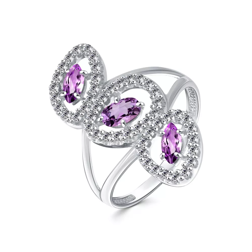 107913-001-0019 Кольцо (Ag 925) Фианит бесцветный круг 1,25, Аметист фиолетовый маркиз 2,5*5, Аметист фиолетовый овал 3*5