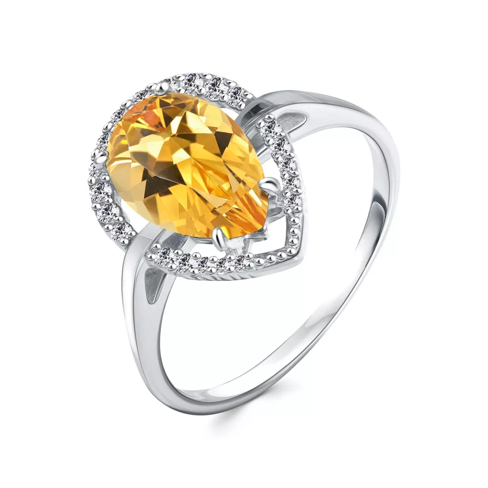 108117-007-0019 Кольцо (Ag 925) Цитрин груша 8*12, Фианит бесцветный круг 1, Фианит бесцветный круг 1,5, Фианит бесцветный круг 1,25