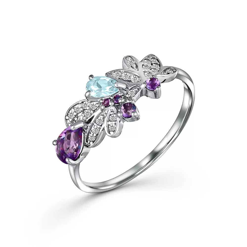 107413-901-2019 Кольцо (Ag 925) Фианит бесцветный круг 1, Топаз голубой груша 3*5, Аметист фиолетовый груша 4*6, Аметист фиолетовый