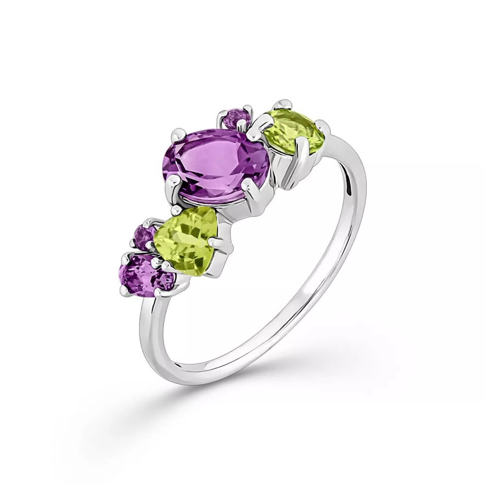 106868-901-0019 Кольцо (Ag 925) Хризолит круг 5, Хризолит триллион 5, Аметист фиолетовый овал 6*8, Аметист фиолетовый овал 3*5, Амет