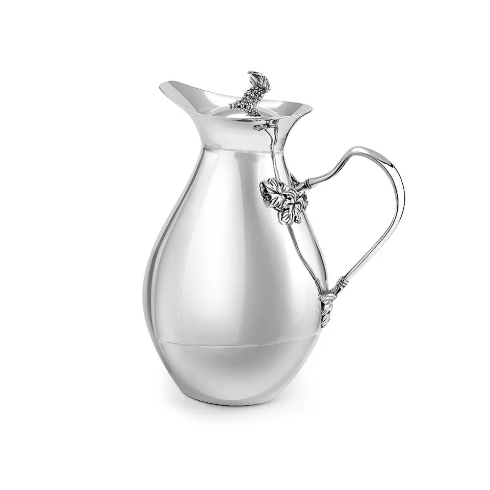 Идеально гладкий кувшин выполнен из серебра 925°. Он имеет простой лаконичный дизайн, без рисунка и вставок. Ручка крышки и кувшина выполнены в виде виноградной лозы. Это изделие достойно пополнит фамильную коллекцию.