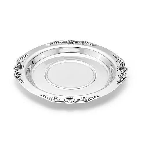 Красивое и экологичное блюдце выполнено из чистого серебра 925 пробы. По его краям изображен растительный узор. Блюдце станет незаменимым украшением любого праздничного стола.