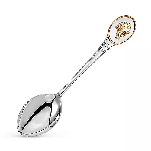 Ложка чайная "Рак" Аккуратная и удобная ложка выполнена из серебра 925°. В верхней части черенка изображен позолоченный знак гороскопа – Рак. Поверхность ложки отполирована вручную, что придает изделию невероятный блеск.