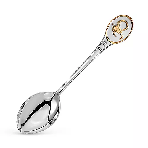 Ложка чайная "Скорпион" Аккуратная и удобная ложка выполнена из серебра 925°. В верхней части черенка изображен позолоченный знак гороскопа – Скорпион. Поверхность ложки отполирована вручную, что придает изделию невероятный блеск.