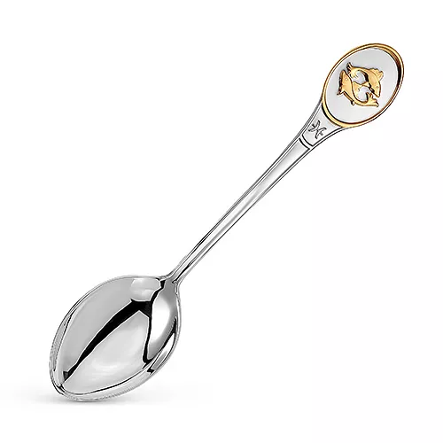 Аккуратная и удобная ложка выполнена из серебра 925°. В верхней части черенка изображен позолоченный знак гороскопа – Рыбы. Поверхность ложки отполирована вручную, что придает изделию невероятный блеск.