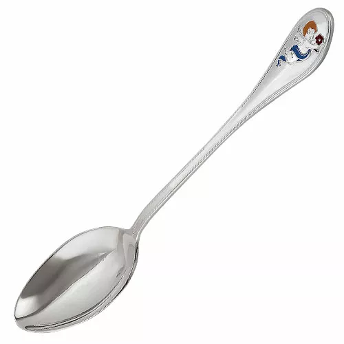 Красивая детская ложечка выполнена из высококачественного серебра 925ׄ°. В верхней части черенка изображен Ангел, декорированный высококачественной яркой эмалью. Поверхность ложки отполирована вручную, что придает изделию невероятный блеск. Серебряная чайная ложка «Ангел» с эмалью - изумительный подарок ребенку.