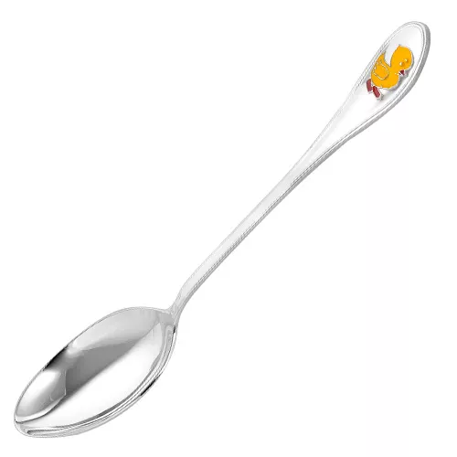 Красивая детская ложечка выполнена из высококачественного серебра 925ׄ°. В верхней части черенка изображен Цыпленок, декорированный высококачественной яркой эмалью. Поверхность ложки отполирована вручную, что придает изделию невероятный блеск. Серебряная чайная ложка «Цыпленок» с эмалью - изумительный подарок ребенку.