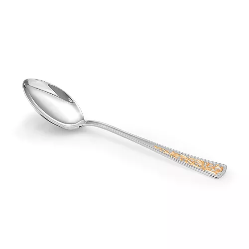 Ложка столовая из набора "Стиль" Аккуратная и удобная ложка выполнена из серебра 925°. Изысканный дизайн, с красивым позолоченным узором на черенке, идеально подойдет для первых и вторых блюд.