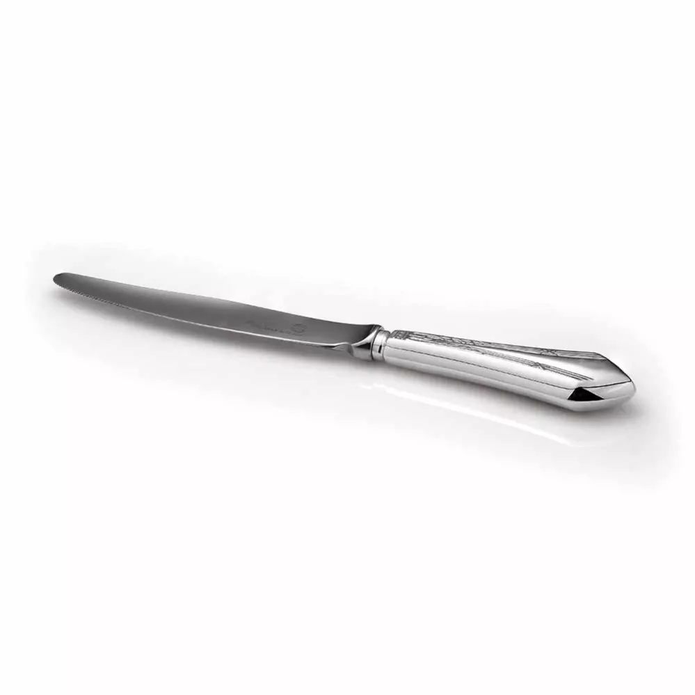 Нож десертный "Элегант" Идеально гладкий нож с отполированной поверхностью и плавно закругленным лаконичным лезвием выполнен из серебра высшей пробы. Черенок ножа украшает красивый узор.