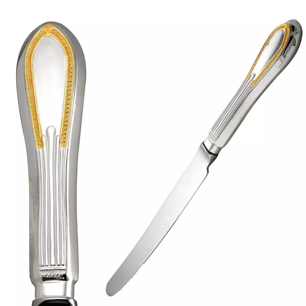 Нож столовый из набора "Ампир". Идеально гладкий нож с отполированной поверхностью и плавно закругленным лаконичным лезвием выполнен из серебра высшей пробы. Черенок ножа украшает красивый позолоченный узор.