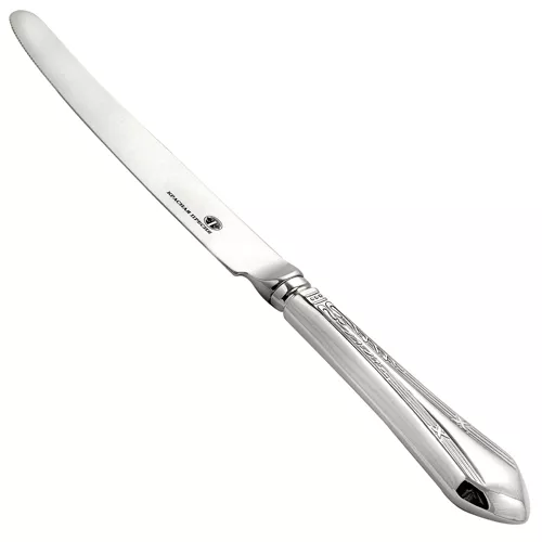 Нож столовый "Элегант". Идеально гладкий нож с отполированной поверхностью и плавно закругленным лаконичным лезвием выполнен из серебра высшей пробы. Черенок ножа украшает красивый узор.