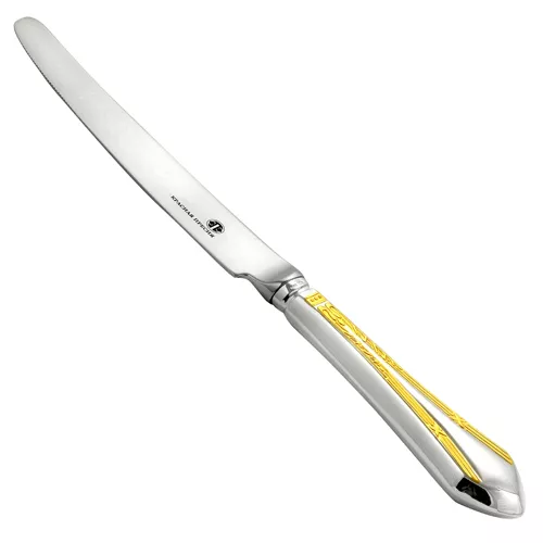 Нож столовый "Элегант". Идеально гладкий нож с отполированной поверхностью и плавно закругленным лаконичным лезвием выполнен из серебра высшей пробы. Черенок ножа украшает красивый позолоченный узор.