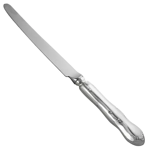 Нож столовый из набора "Вензель". Идеально гладкий нож с отполированной поверхностью и плавно закругленным лаконичным лезвием выполнен из серебра 925 пробы. Черенок ножа украшает красивый узор.