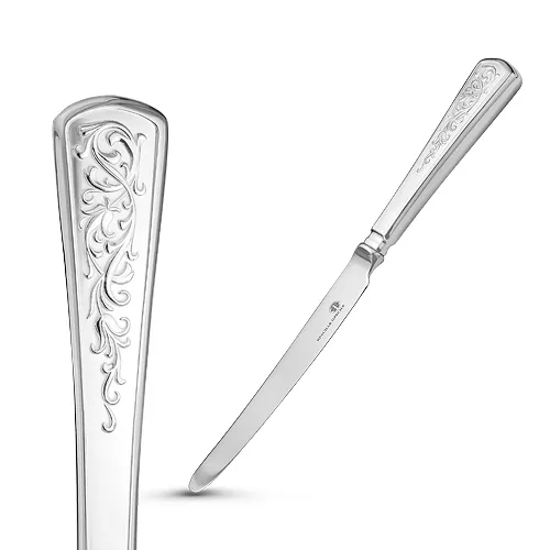 Нож столовый "Стиль". Идеально гладкий нож с отполированной поверхностью и плавно закругленным лаконичным лезвием выполнен из серебра 925°. Черенок ножа украшает красивый узор.