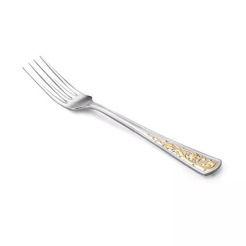 Вилка столовая из набора "Стиль". Аккуратная и удобная ложка выполнена из серебра 925°. Изысканный дизайн, с красивым позолоченным узором на черенке, идеально подойдет для второго блюда.